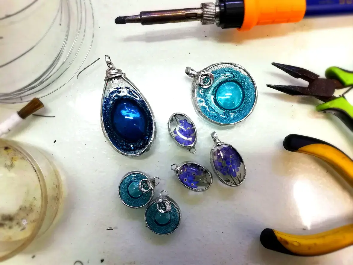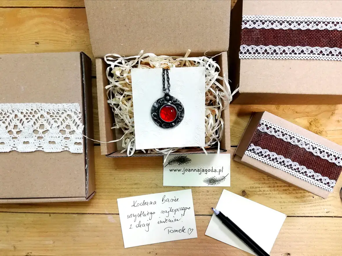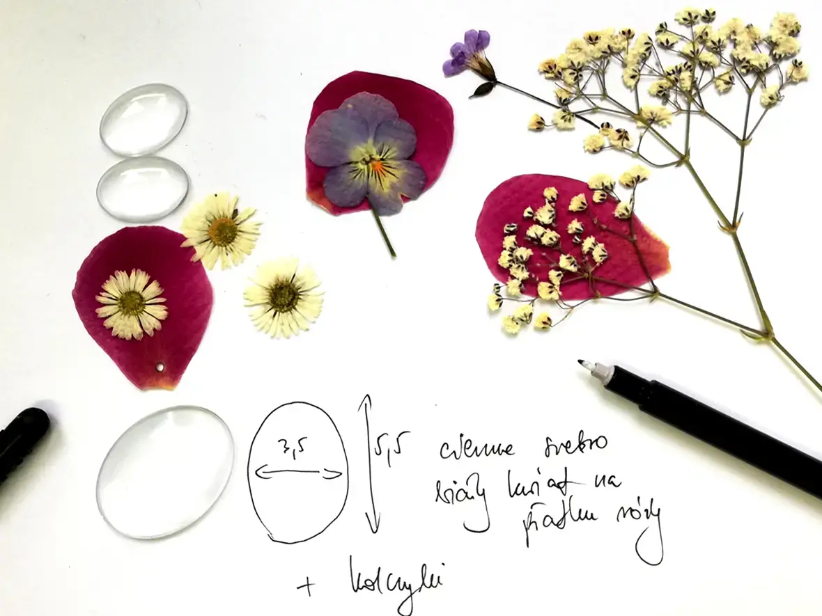 Moja biżuteria powstaje z różnych materiałów. Głównie jest to wytopione przeze mnie szkło. Są to też różnorodne kamienie naturalne, surowe i szlifowane. Jednak największą przyjemność sprawia mi praca z kwiatami. Bardzo lubię je zbierać, suszyć i zamykać w szkle.