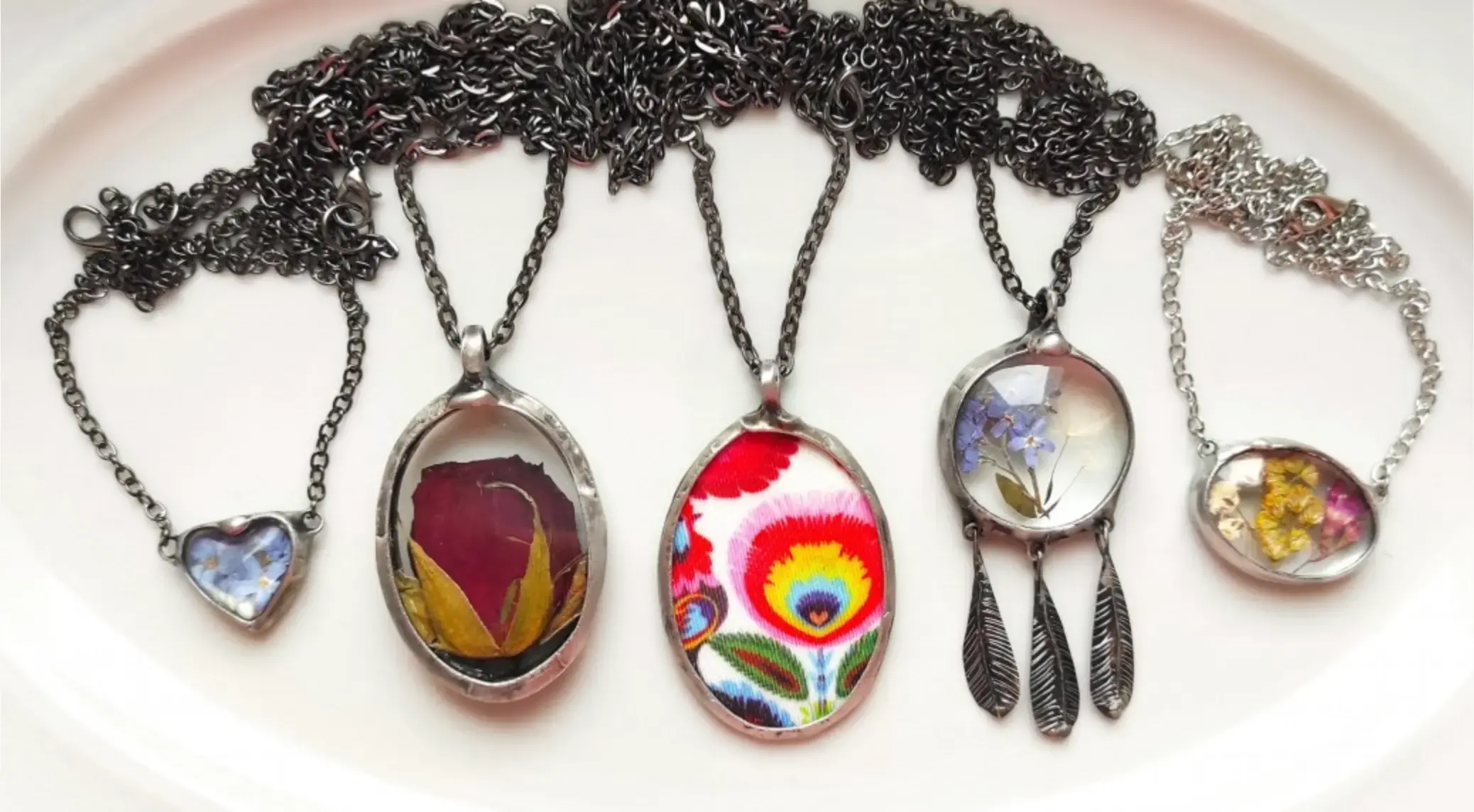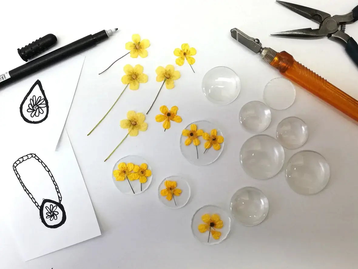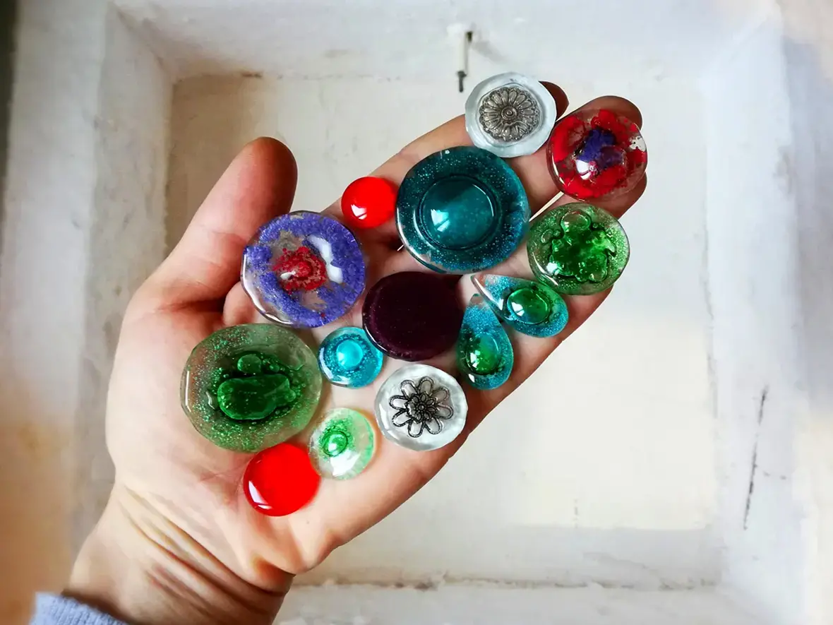 Moja biżuteria powstaje z różnych materiałów. Głównie jest to wytopione przeze mnie szkło. Są to też różnorodne kamienie naturalne, surowe i szlifowane. Jednak największą przyjemność sprawia mi praca z kwiatami. Bardzo lubię je zbierać, suszyć i zamykać w szkle.
