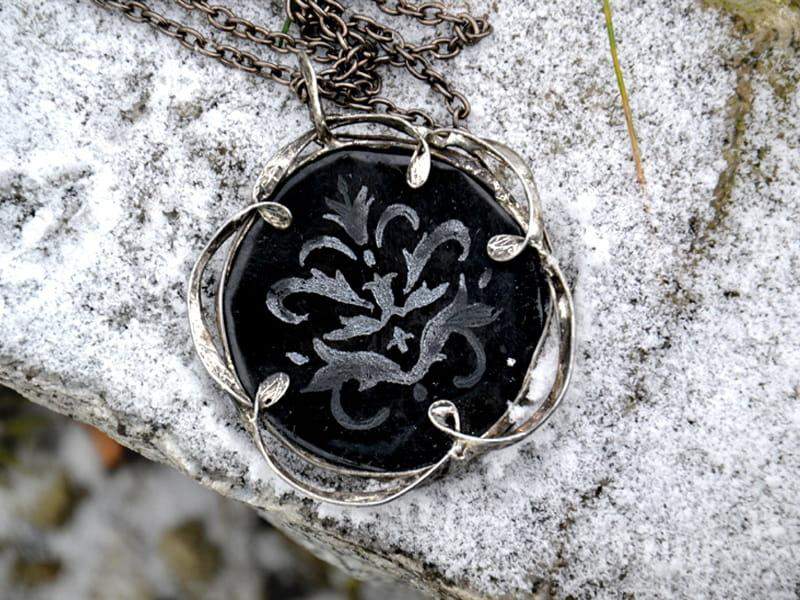 Ozdobny naszyjnik z grawerowanym szkłem. Wykonany jest ze szkła stapianego oprawionego w ekologiczną cynę. Oprawa stylizowana jest na stare srebro. Do wisiora dołączony jest łańcuch o długości 80cm z możliwością regulacji. Średnica wisiora to ok. 5 cm. Biżuteria w 100% wykonana ręcznie, poszczególne sztuki mogą się minimalnie różnić.