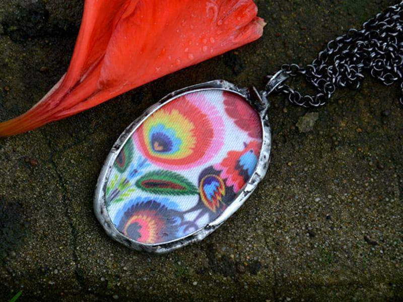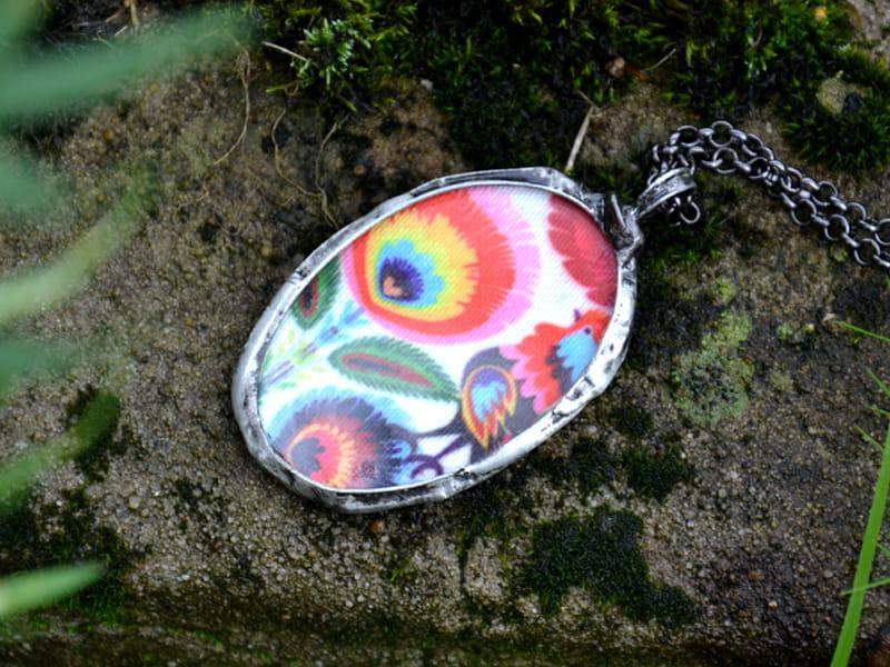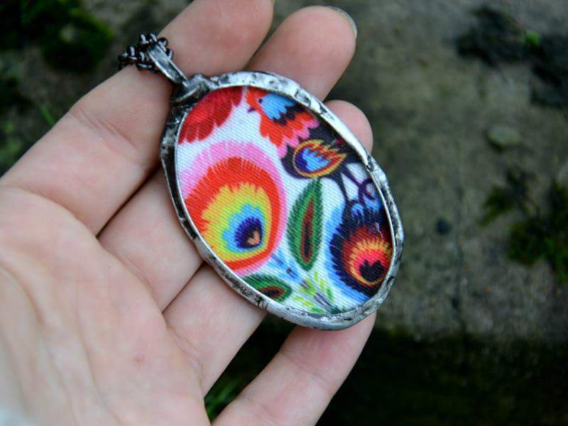 Unikatowy naszyjnik z motywem folkowym. Rustykalna oprawa wykonana z miedzi pokrytej ekologiczną cyną w kolorze starego srebra. Długość wisiora to ok. 6 cm. Biżuteria w 100% wykonana ręcznie, poszczególne sztuki mogą się minimalnie różnić.