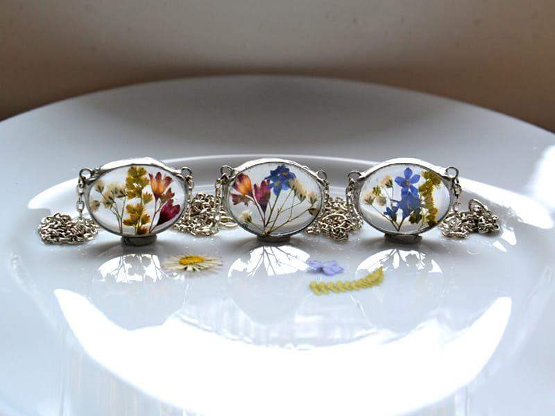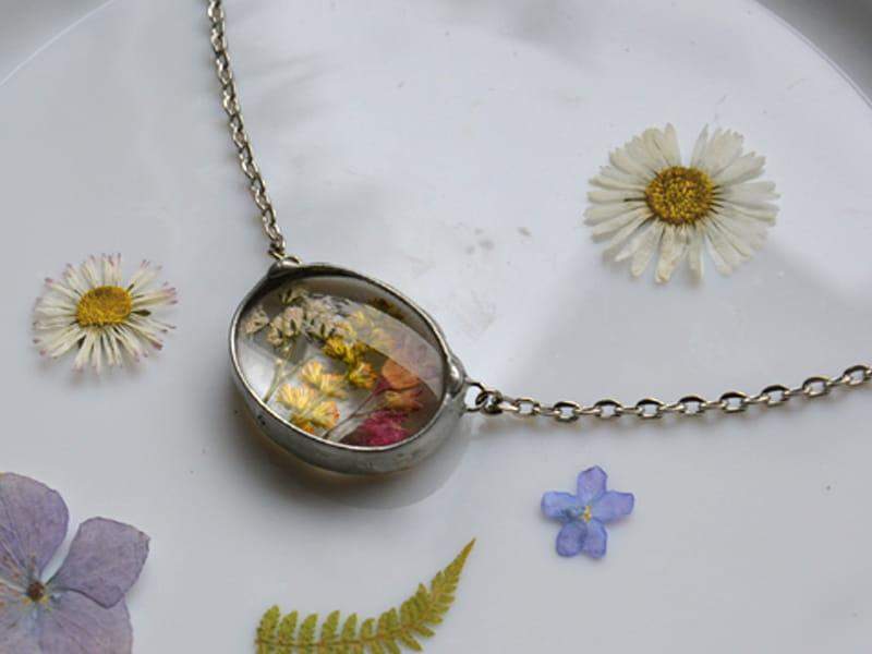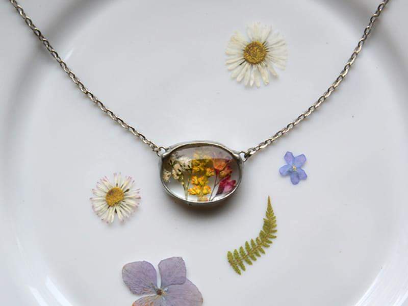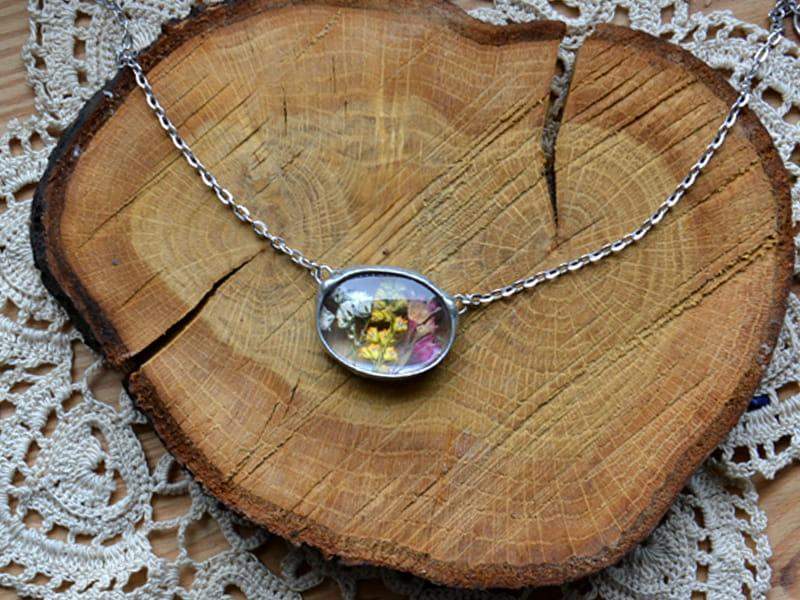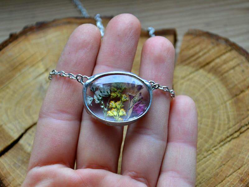 Delikatny naszyjnik z zamkniętymi w szkle polnymi kwiatami.