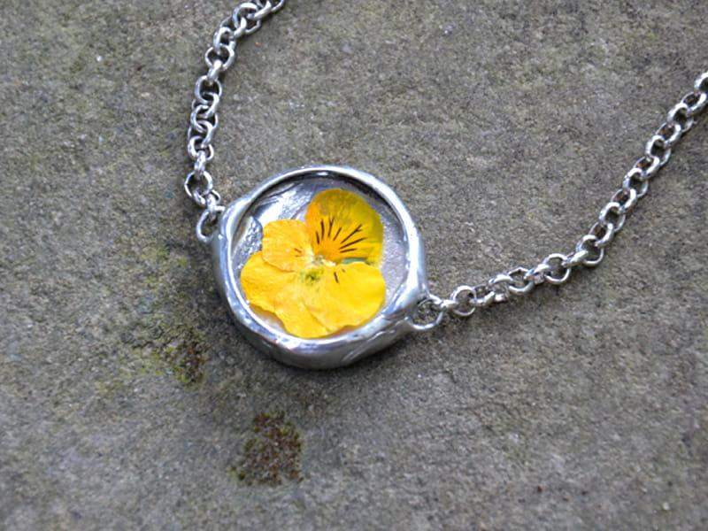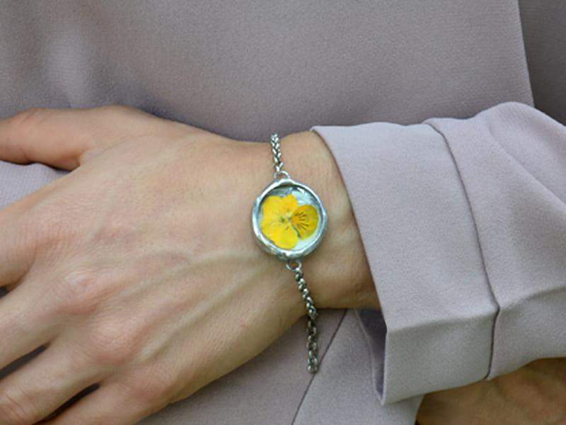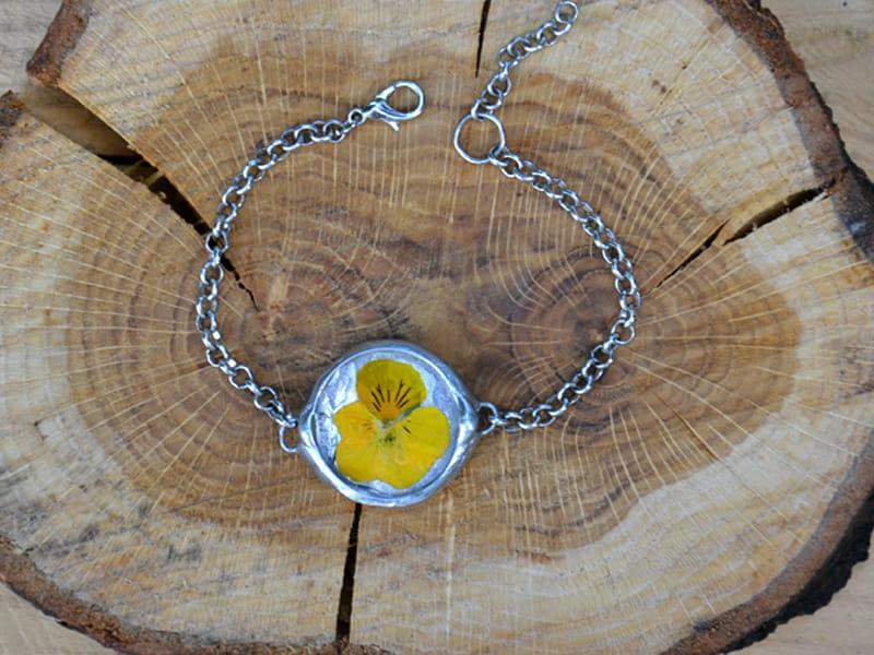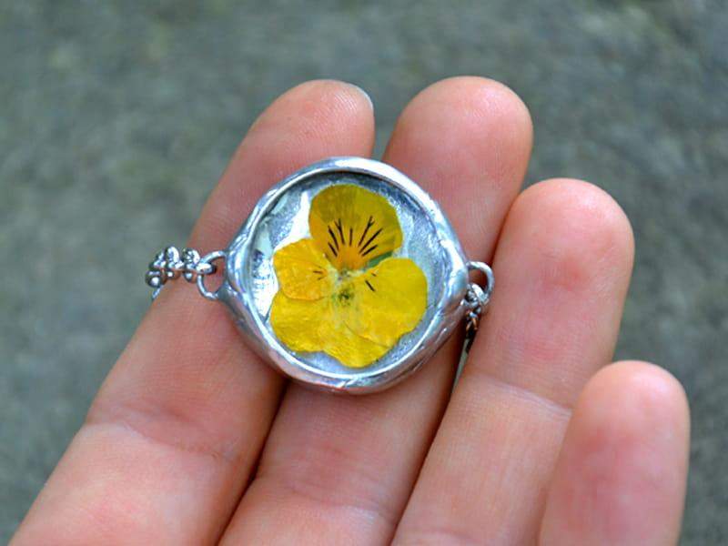 Romantyczna bransoletka z zamkniętym w szkle bratkiem.