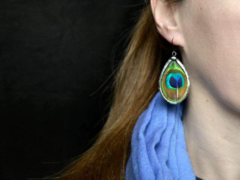 Bardzo efektowne kolczyki z pawimi piórami zamkniętymi w szkle. Rustykalna oprawa wykonana z miedzi pokrytej ekologiczną cyną w kolorze starego srebra. Długość kolczyka to ok. 6 cm. Biżuteria w 100% wykonana ręcznie, poszczególne sztuki mogą się minimalnie różnić.