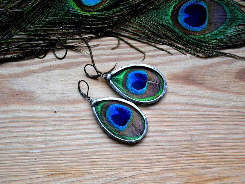 Bardzo efektowne kolczyki z pawimi piórami zamkniętymi w szkle.