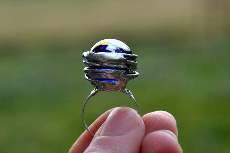 Unikatowy pierścionek z granatowym połyskującym szkiełkiem.