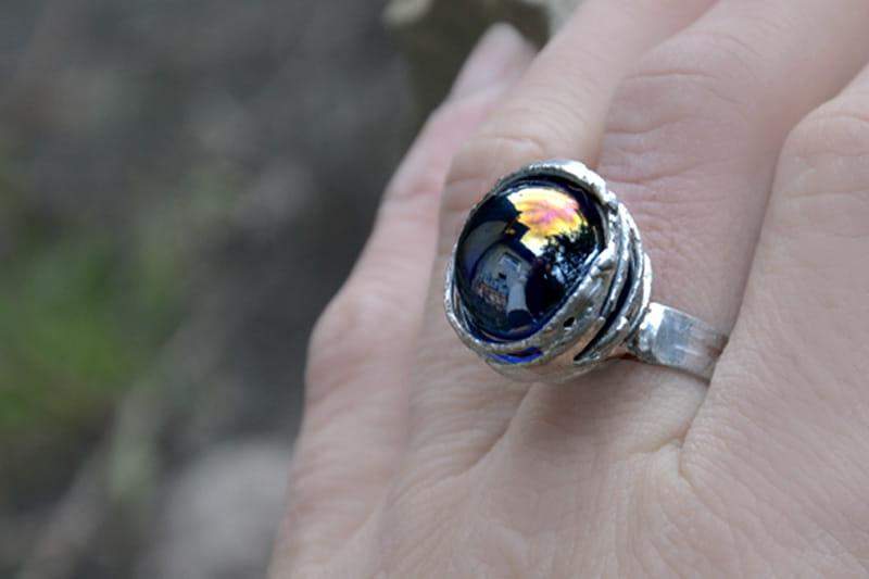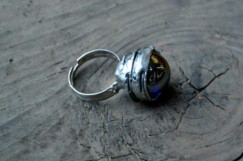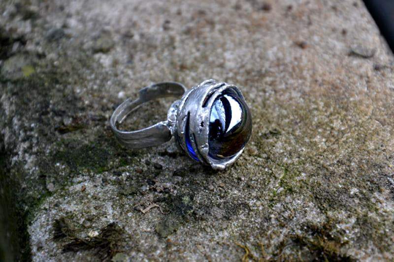Unikatowy pierścionek z granatowym połyskującym szkiełkiem. Oprawa w kolorze srebrnym wykonana z ekologicznej cyny. Średnica oczka to ok. 1,5 cm. Obrączka regulowana. Biżuteria w 100% wykonana ręcznie, poszczególne sztuki mogą się nieznacznie różnić.