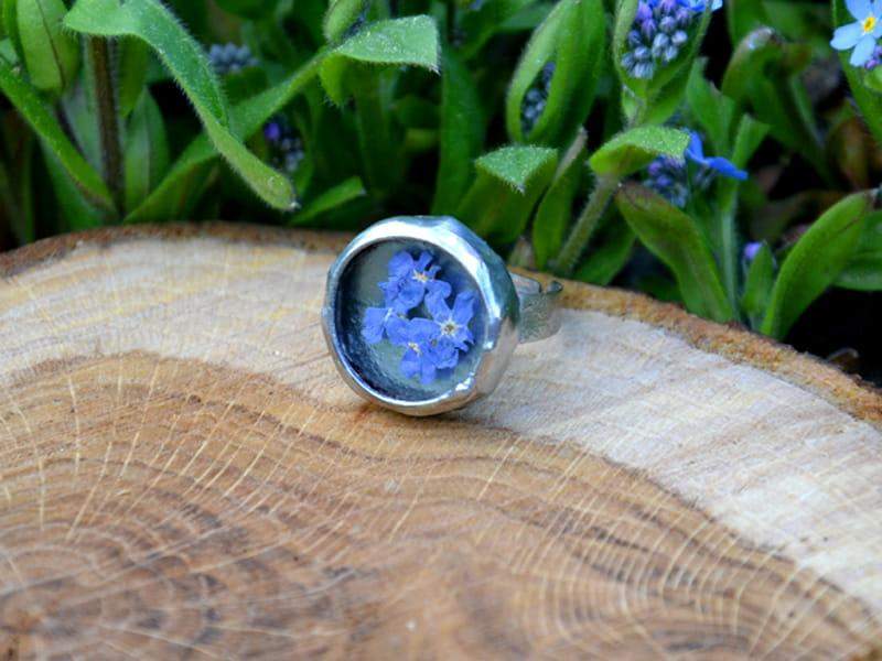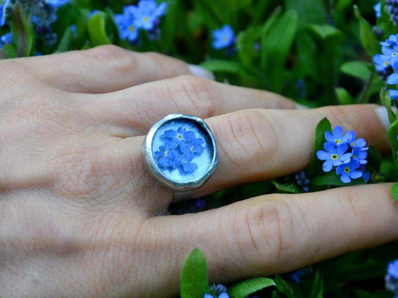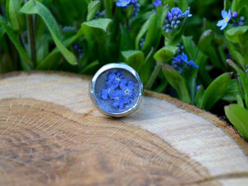 Pierścionek z zamkniętymi w szkle niezapominajkami.