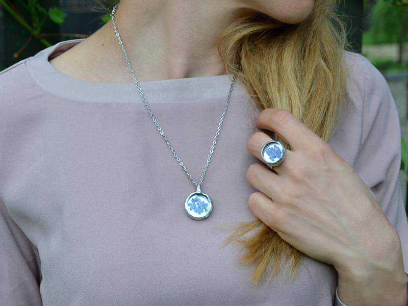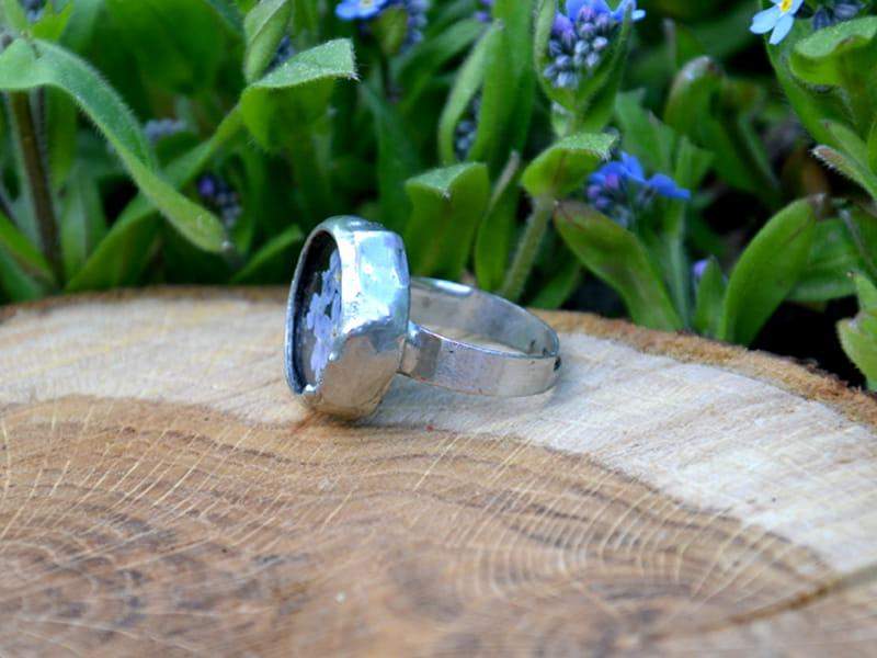 Idealny dodatek dla romantyczki. Pierścionek z zamkniętymi w szkle niezapominajkami. Średnica oczka pierścionka to ok. 2 cm. Oprawa w kolorze srebrnym wykonana z ekologicznej cyny. Obrączka regulowana. Biżuteria w 100% wykonana ręcznie, więc poszczególne egzemplarze mogą nieznacznie się między sobą różnić.