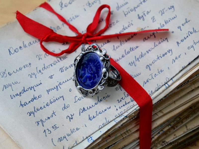 Ozdobny pierścionek z misternym, ornamentalnym wzorem i grawerowanym szkłem. Szkiełko pierścionka ma piękny głęboki szafirowy kolor, na którym wygrawerowany został ornamentalny wzór. Stworzony z myślą o romantyczkach.