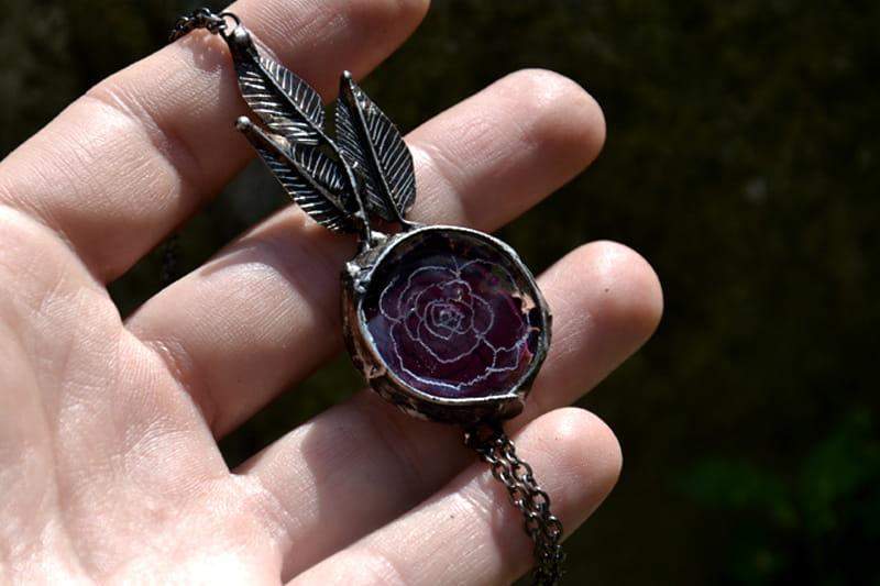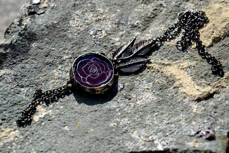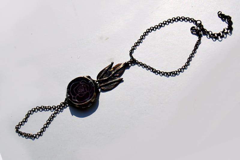 Bransoletka na palec. Bakłażanowe szkło o średnicy 2,5 cm z wygrawerowaną różyczką oprawione jest w ekologiczną cynę stylizowaną na stare srebro. Długość dekoracyjnego elementu pomiędzy bransoletką a pierścionkiem to ok. 8 cm, natomiast obwód bransoletki to ok. 18 cm plus 3 cm regulacji. Bransoletkę wykonam z przyjemnością w każdym rozmiarze. Biżuteria w 100% wykonana ręcznie, poszczególne sztuki mogą się minimalnie różnić.