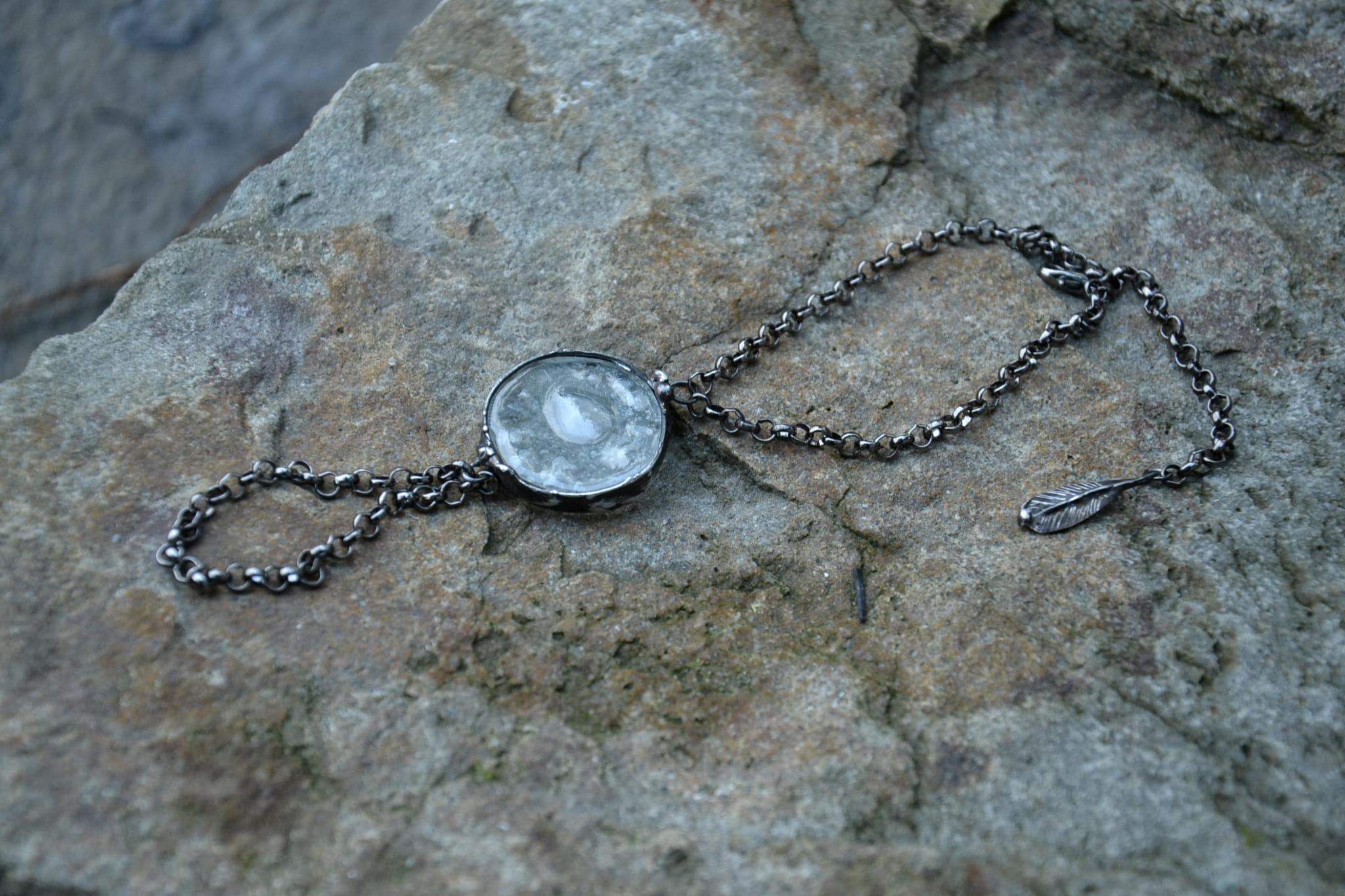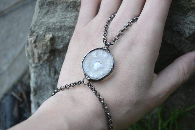 Boho bransoletka z łańcuszkiem na palec. Szkiełko pełne białych bąbelków oprawione w stylizowaną na stare srebro ekologiczną cynę. Bransoleta dopasowana na rękę o obwodzie nadgarstka 17 cm. Bardzo chętnie wykonam bransoletkę w innym rozmiarze! Biżuteria w 100% wykonana ręcznie, poszczególne sztuki mogą się minimalnie różnić