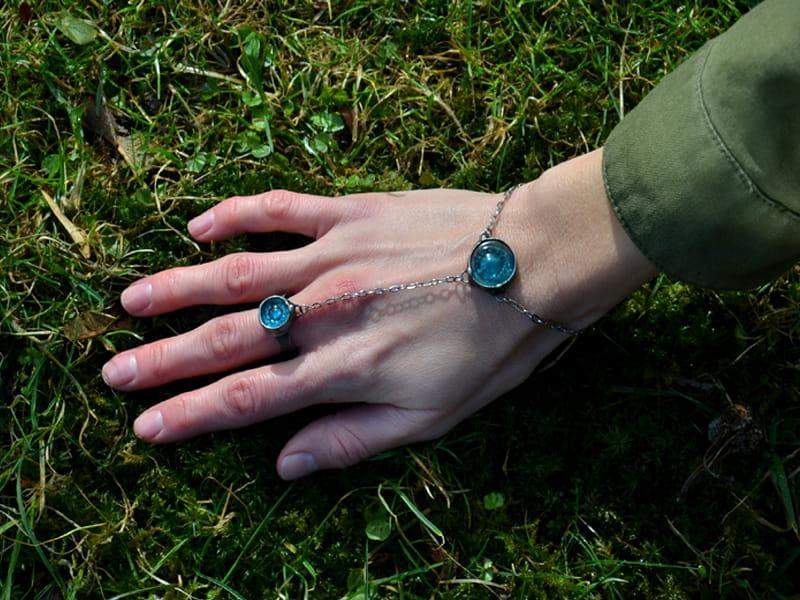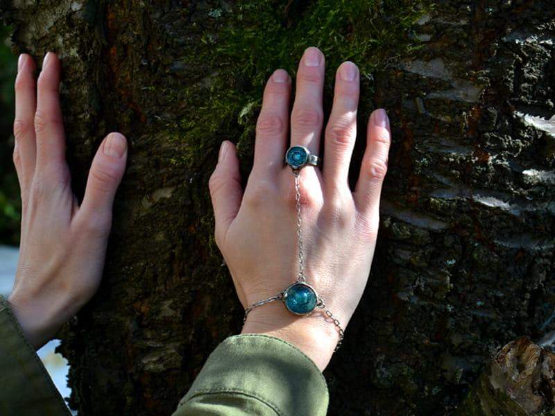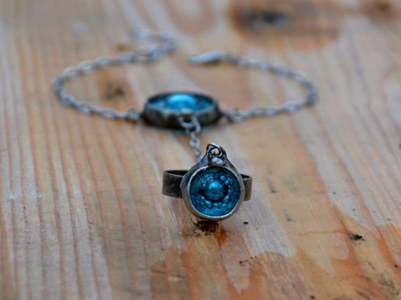 Bransoletka na palec. Turkusowe szkiełka oprawione są w ekologiczną cynę stylizowaną na ciemne srebro. Długość łańcuszka pomiędzy pierścionkiem a bransoletką to ok. 9 cm, natomiast obwód bransoletki to ok.17 cm plus 3 cm regulacji. Łańcuszek wykonany ze stali chirurgicznej. Pierścionek jest regulowany. Wykonam ja z przyjemnością w każdym rozmiarze. Biżuteria w 100% wykonana ręcznie, poszczególne sztuki mogą się minimalnie różnić.
