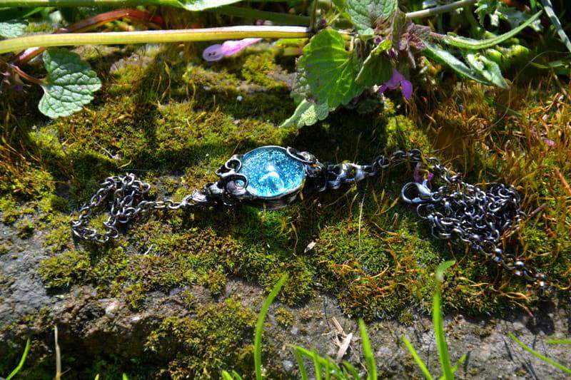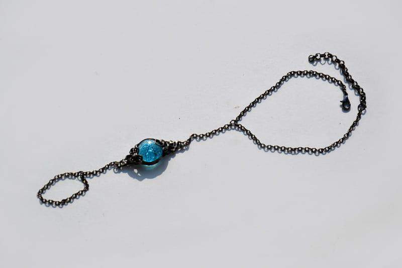Bransoletka na palec. Pełne turkusowych bąbelków szkiełko oprawione jest w ekologiczną cynę stylizowaną na stare srebro. Obwód łańcuszka na palec to 6 cm, natomiast obwód bransoletki to ok.17 cm. Wykonam ja z przyjemnością w każdym rozmiarze.