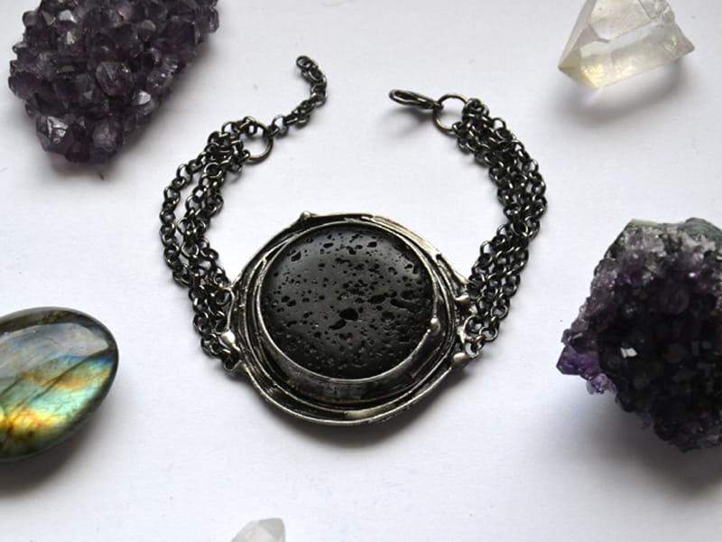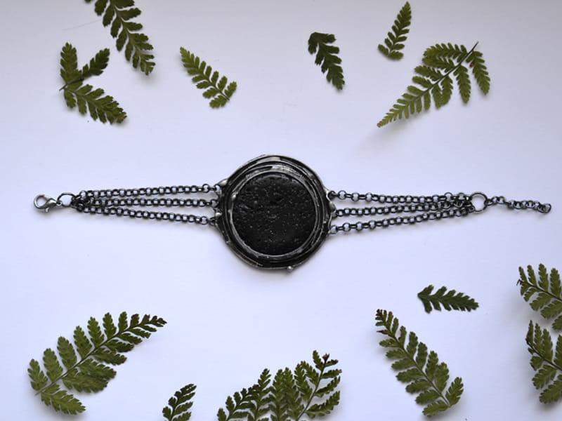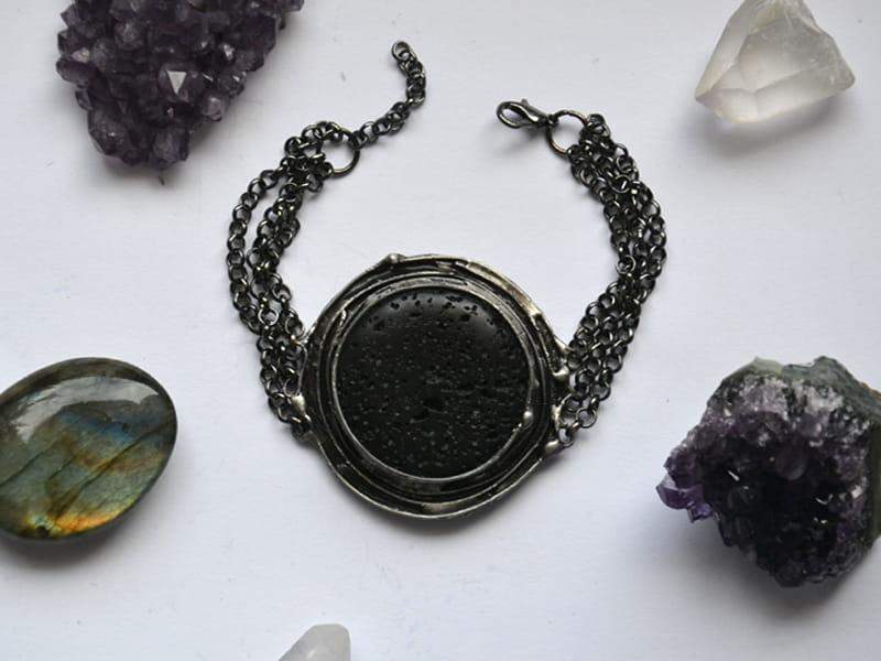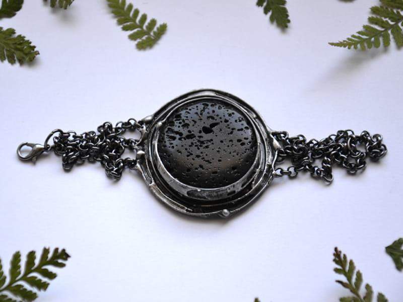 Rustykalna bransoleka z lawą wulkaniczną. Średnica kamienia wraz z oprawą to 4,5 cm. Całość wykonana z ekologicznej cyny stylizowanej na stare srebro. Długość bransoletki to 18 cm + 2 cm regulacji. Bardzo chętnie wykonam bransoletkę w innym rozmiarze!