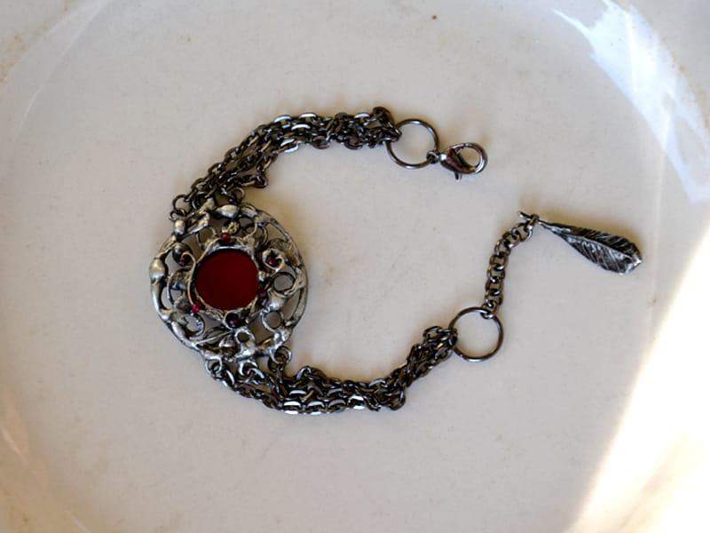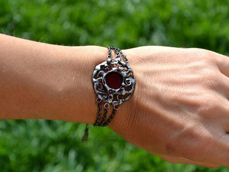 Ozdobna bransoletka z misternym, ornamentalnym wzorem, szkłem w głębokiej czerwieni i maleńkimi fasetowanymi rubinami. Oprawa wykonana z ekologicznej cyny stylizowana jest na ciemne srebro. Długość bransoletki to 18 cm plus 2 cm regulacji. Z przyjemnością wykonam ją w innym rozmiarze. Biżuteria w 100% wykonana ręcznie, poszczególne sztuki mogą się minimalnie różnić.