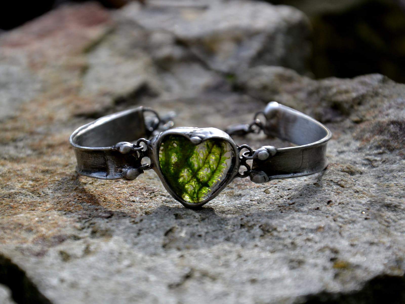 Romantyczna bransoletka z mchem zamkniętym w szklanym serduszku. Oprawa z miedzi z dodatkiem ekologicznej cyny. Oprawa ma kolor starego srebra. Bransoleta o obwodzie 18 cm z 2 cm łańcuszkiem do regulacji. Bardzo chętnie wykonam bransoletkę w innym rozmiarze! Biżuteria w 100% wykonana ręcznie, poszczególne sztuki mogą się minimalnie różnić.