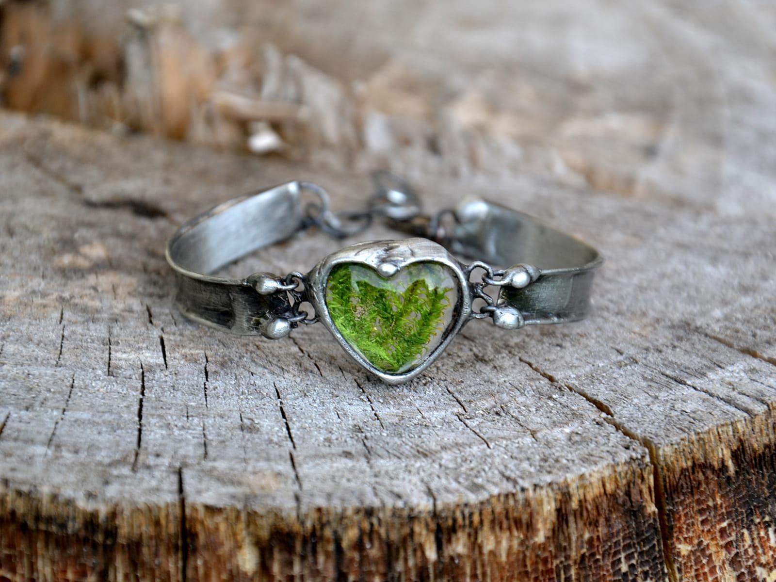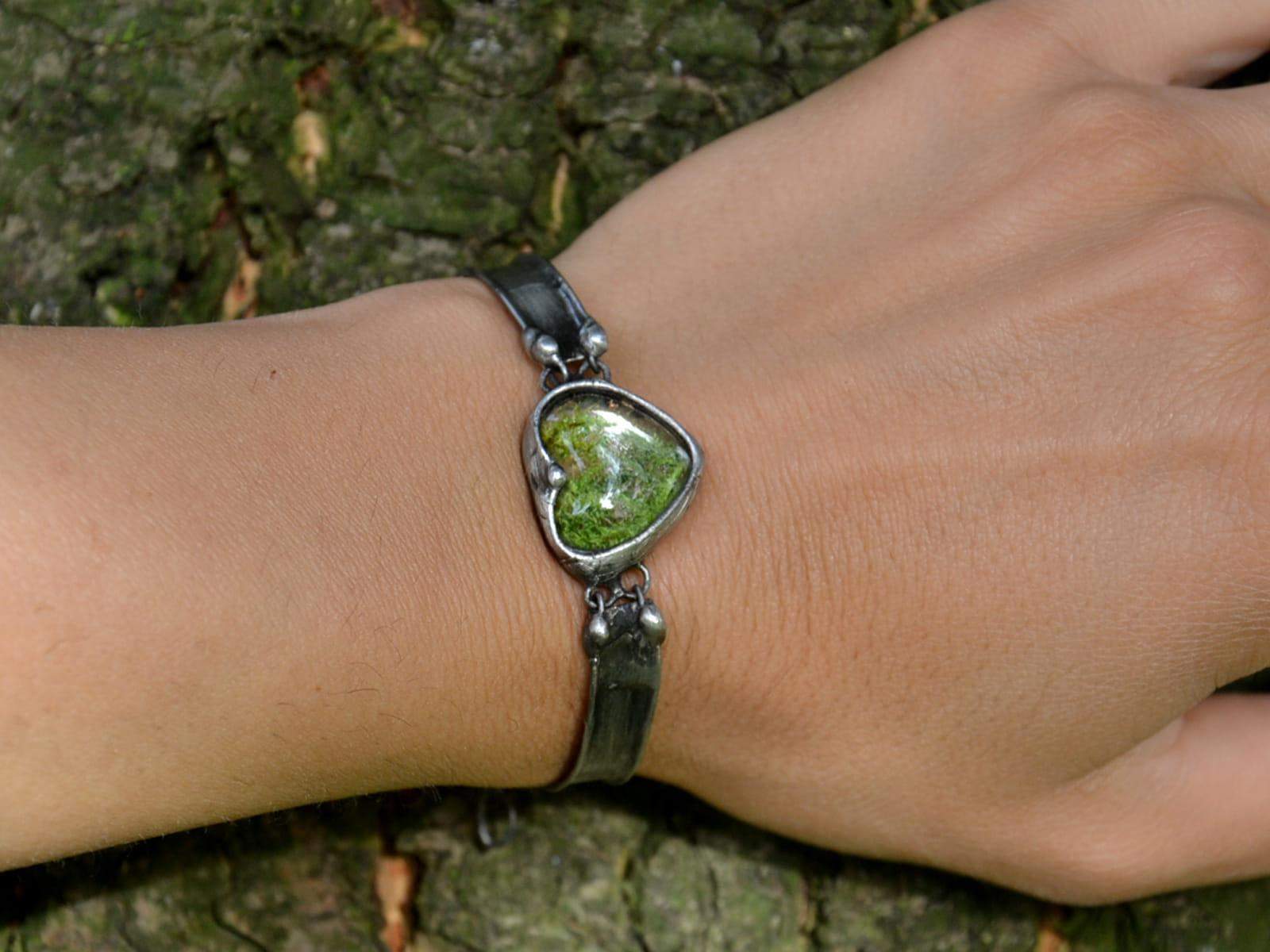 Romantyczna bransoletka z mchem zamkniętym w szklanym serduszku.