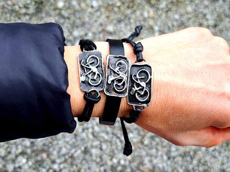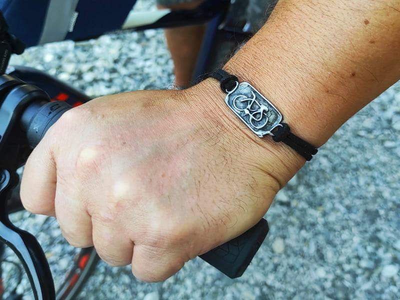 Bransoletka z rowerem na czarnym rzemieniu
