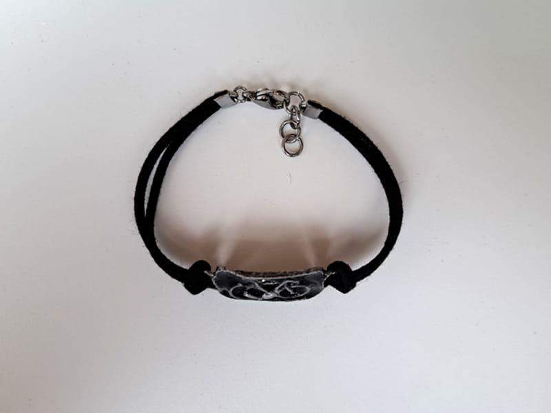Bransoletka wykończona jest czarnym zamszowym rzemieniem i zapięciem wykonanym ze stali chirurgicznej.