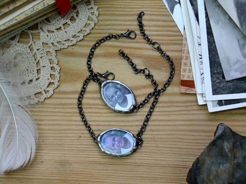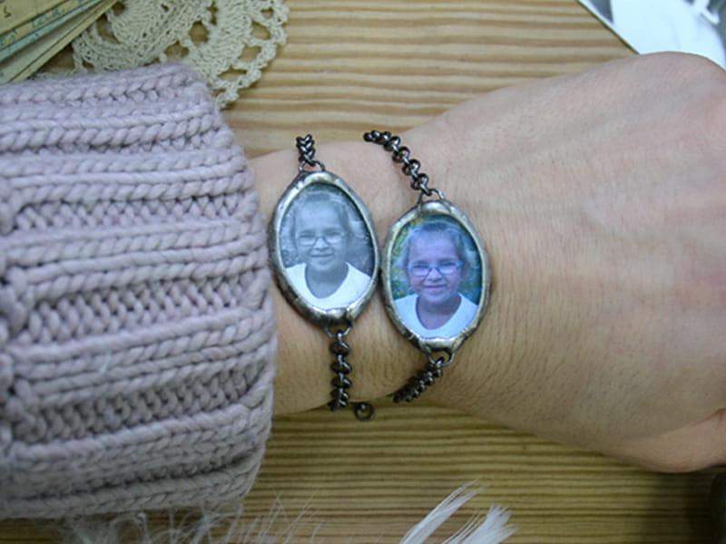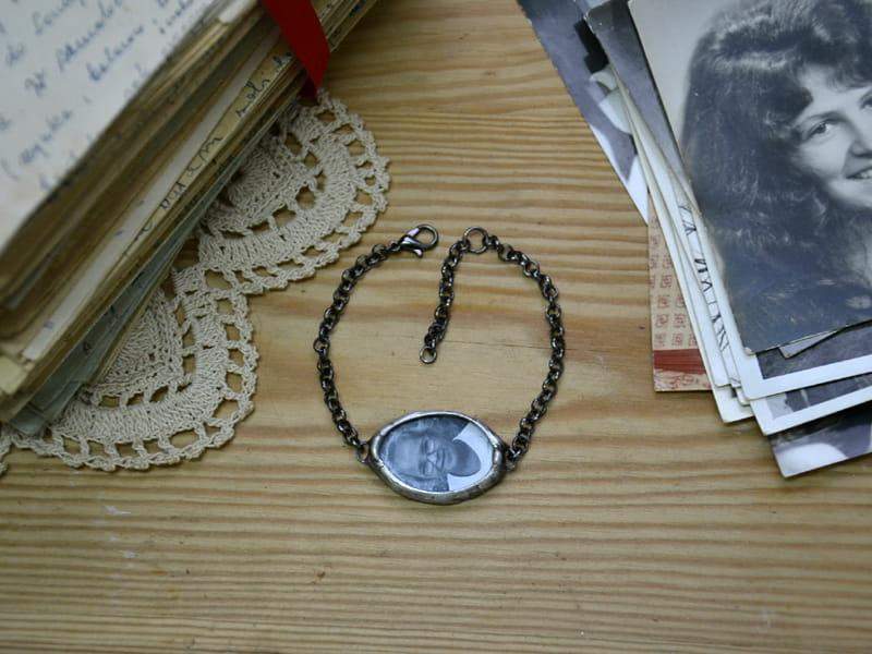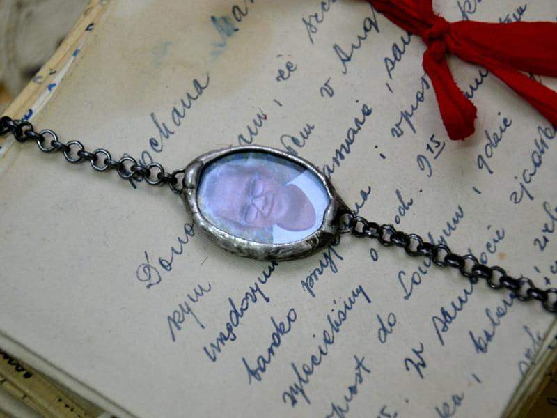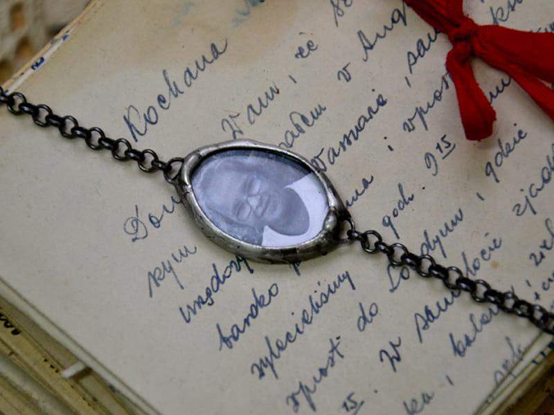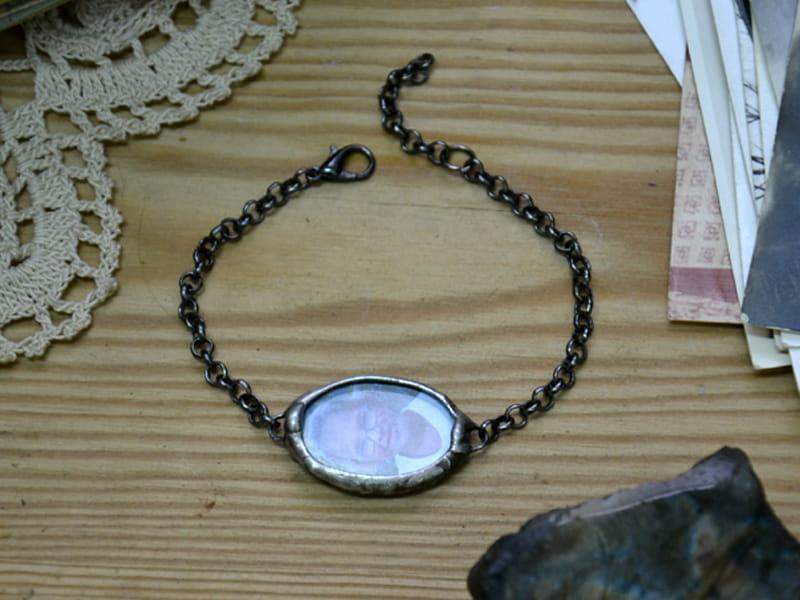 Bransoletka z portretem bliskiej Ci osoby. Prześlij do mnie zdjęcie (w formie cyfrowej w formacie jpg) a ja zamknę je dla Ciebie w szkle. Wymiary szkła z oprawą to 2 x 3 cm. Oprawa wykonana z miedzi pokrytej ekologiczną cyną stylizowaną na stare srebro. Obwód bransoletki to 18 cm + 2 cm regulacji. Wykonam bransoletkę w każdym rozmiarze.