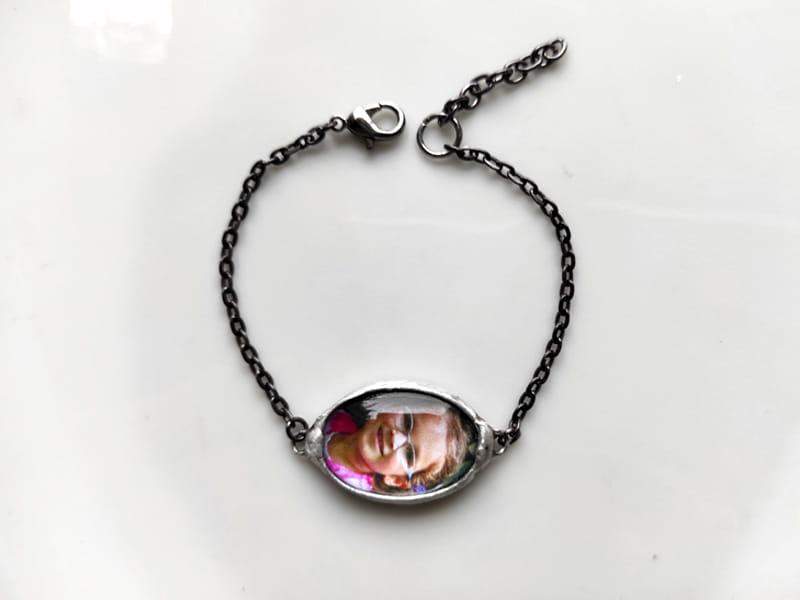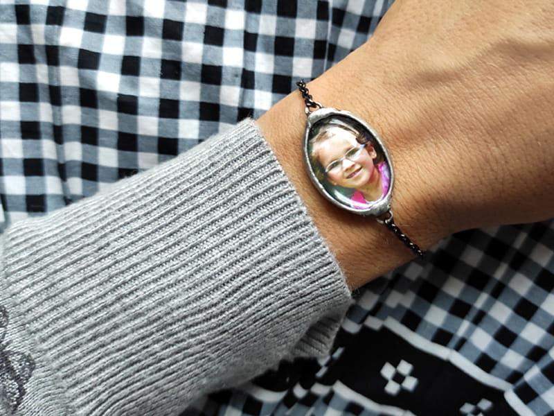 Bransoletka z dowolnym zdjęciem lub grafiką zamkniętą wewnątrz. Rustykalna oprawa wykonana z ekologicznej cyny stylizowanej na kolor srebrny lub kolor ciemnego srebra. Wymiary zdjęcia z oprawą to ok. 2 x 3 cm. Obwód bransoletki 18 cm ale wykonam ją w każdym rozmiarze. Biżuteria w 100% wykonana ręcznie, poszczególne sztuki mogą się minimalnie różnić