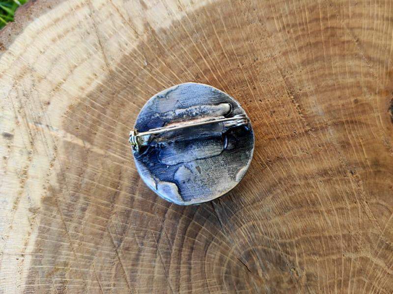 Broszka wykonana została metodą witrażową ze szkła, miedzi i ekologicznej cyny. Oprawa stylizowana jest na kolor ciemnego srebra. Zapięcie broszki posiada blokadę zabezpieczającą przed przypadkowym odpięciem.