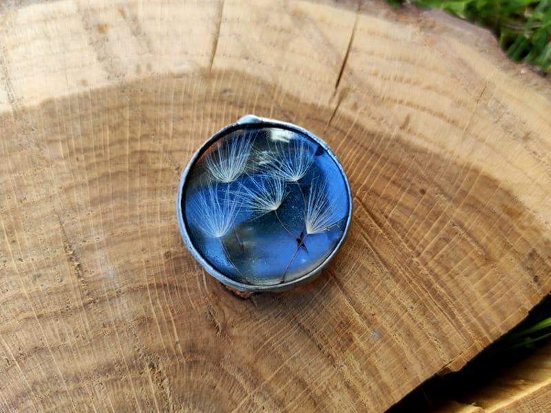 Romantyczna broszka z dmuchawcami zamkniętymi w szkle.