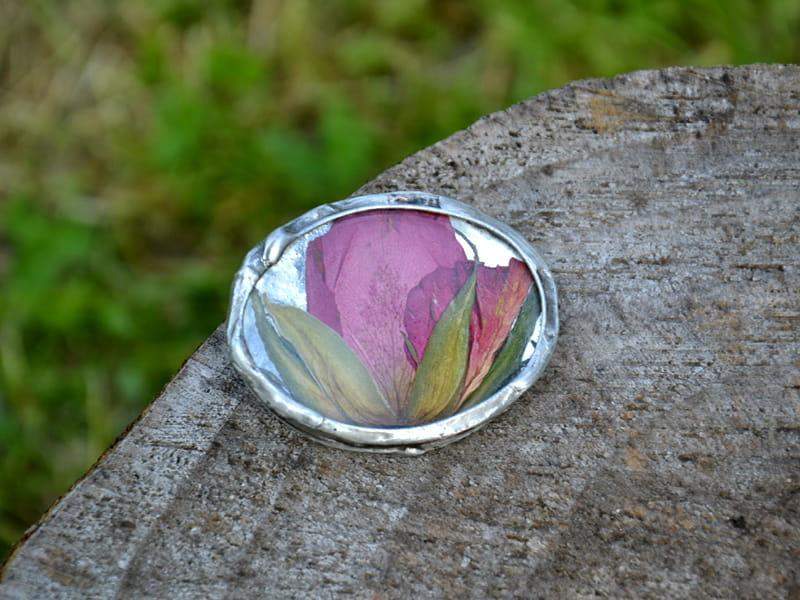 Niepowtarzalna broszka z różą zamkniętą w szkle.