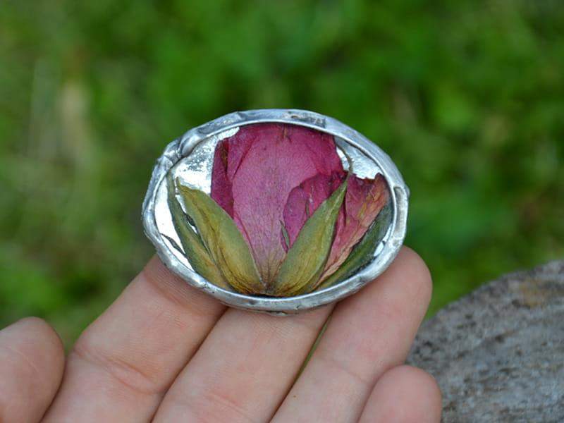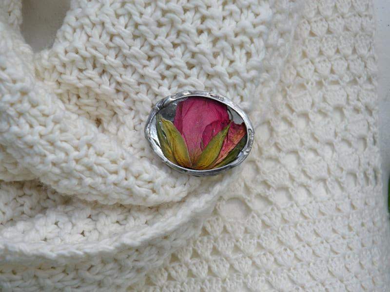 Niepowtarzalna broszka z różą zamkniętą w szkle. Wymiary: 5 x 3,5 cm. Oprawa wykonana z miedzi pokrytej ekologiczną cyną stylizowaną na stare srebro. Biżuteria w 100% wykonana ręcznie, poszczególne sztuki mogą się minimalnie różnić.
