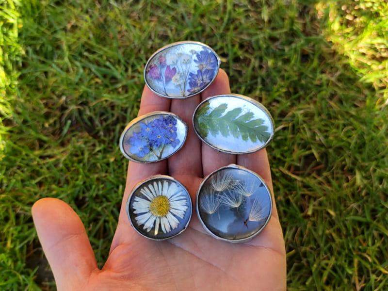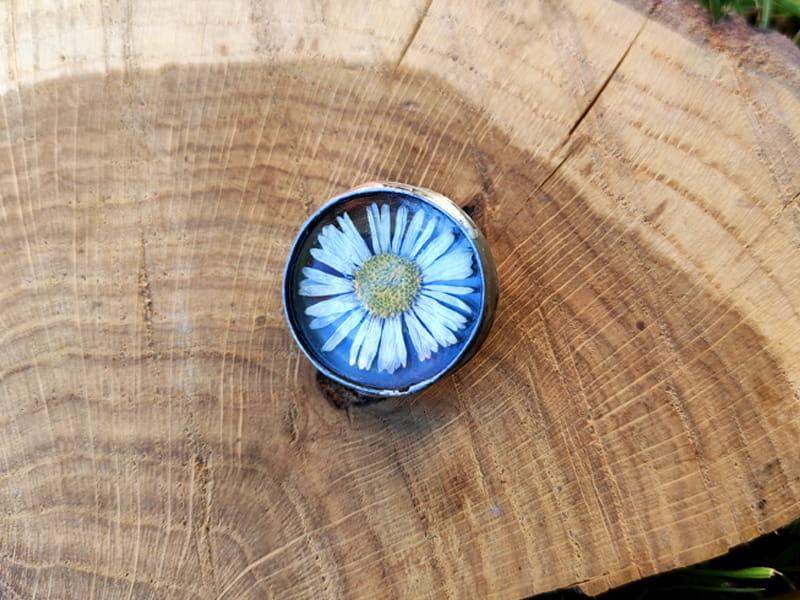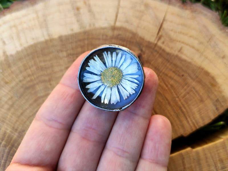 Romantyczna broszka ze stokrotką zamkniętą w szkle.