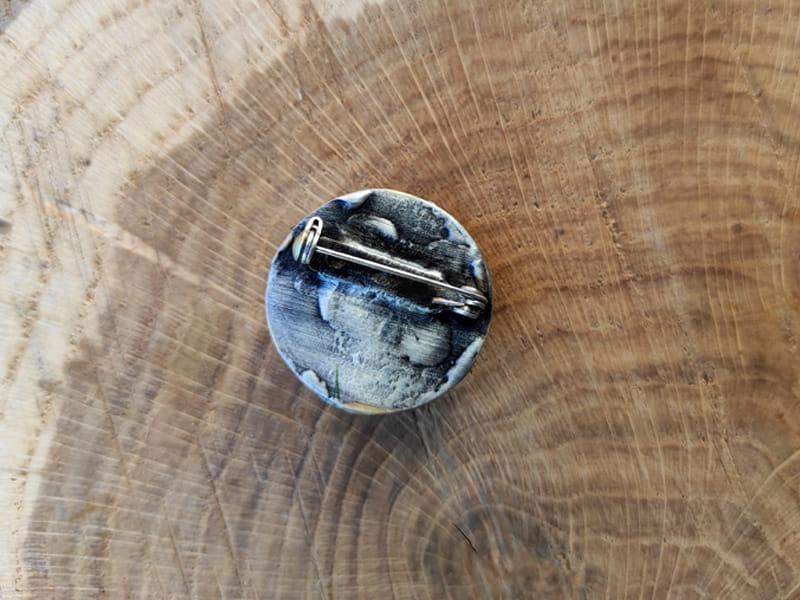 Broszka wykonana została metodą witrażową ze szkła, miedzi i ekologicznej cyny. Oprawa stylizowana jest na kolor ciemnego srebra. Zapięcie broszki posiada blokadę zabezpieczającą przed przypadkowym odpięciem.