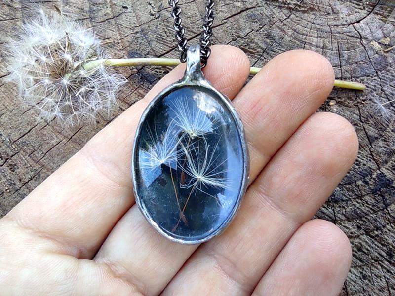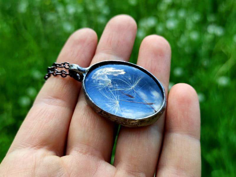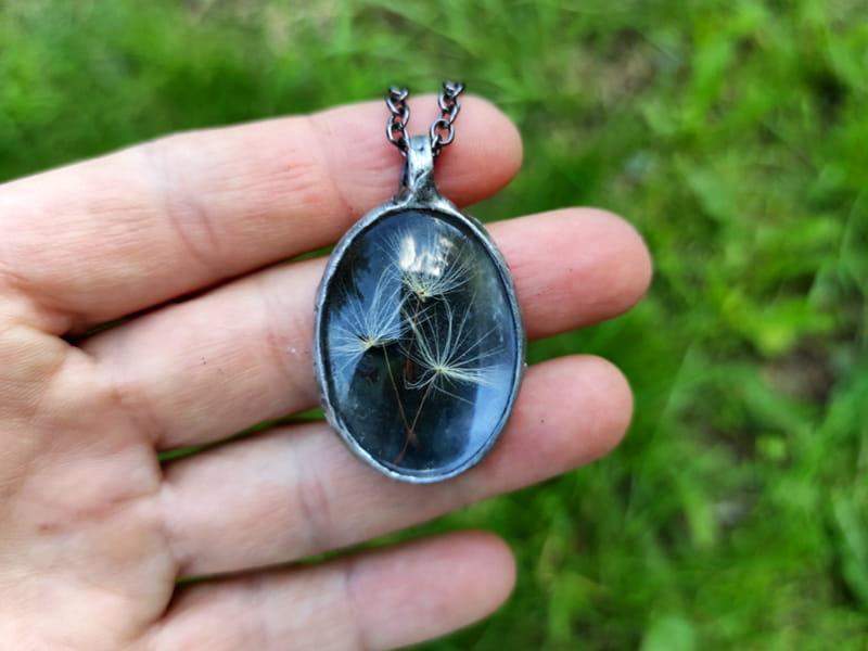 Rustykalny naszyjnik z zamkniętymi w szkle nasionami dmuchawca.