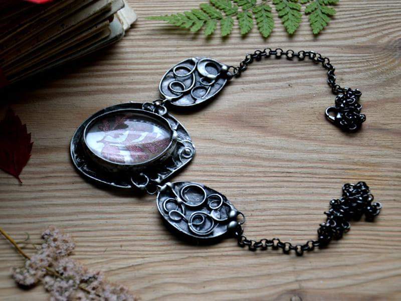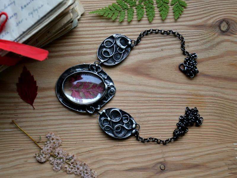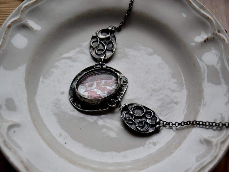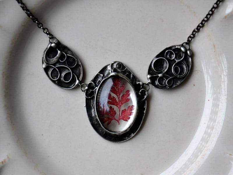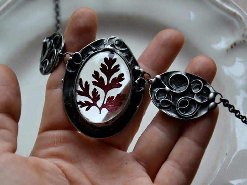Dekoracyjny naszyjnik z zamkniętymi w szkle czerwonymi listeczkami. Ozdobna oprawa wykonana z miedzi pokrytej ekologiczną cyną stylizowaną na stare srebro. Wymiary największego elementu o ok. 4 x 5 cm. Obwód naszyjnika to 50 cm plus 5 cm regulacji. Biżuteria w 100% wykonana ręcznie. Poszczególne sztuki mogą nieznacznie różnić się od siebie.