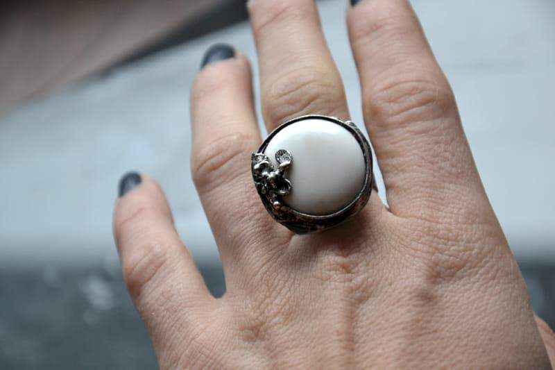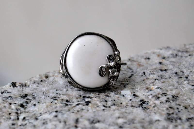 Subtelny, romantyczny pierścionek ze szkłem. Średnica szkła wraz ze stylizowaną na stare srebro oprawą to ok. 2 cm. Obrączka regulowana. Biżuteria w 100% wykonana ręcznie, poszczególne sztuki mogą się minimalnie różnić.