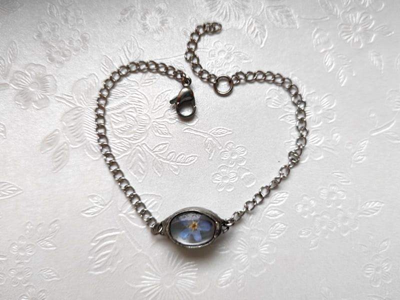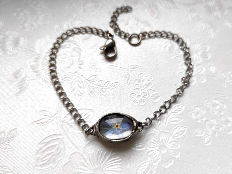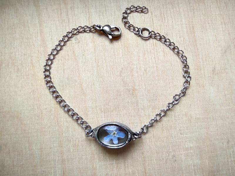 Delikatna, niewielka bransoletka z zamkniętą w szkle niezapominajką. Wymiary oczka z kwiatem to ok. 1,5 x 1 cm. Oprawa w kolorze ciemnego srebra. Z przyjemnością wykonam bransoletkę o innym obwodzie. Biżuteria w 100% wykonana ręcznie, poszczególne sztuki mogą się minimalnie różnić.