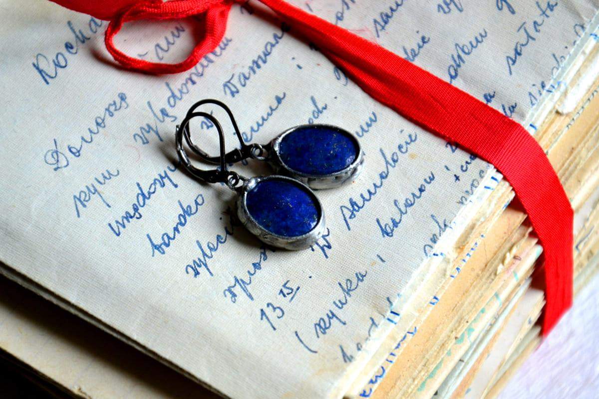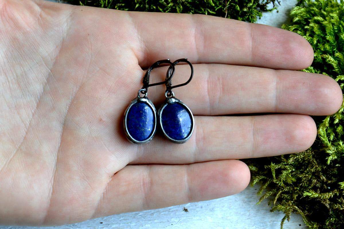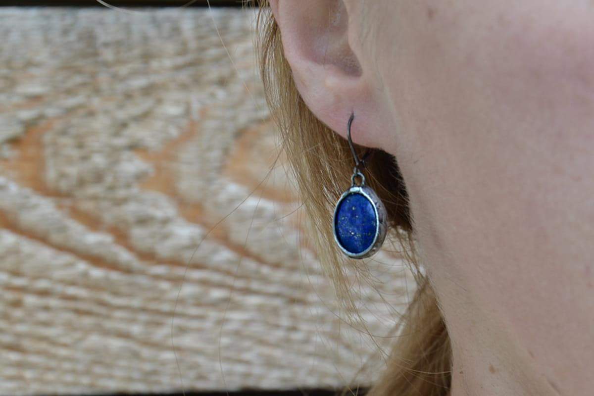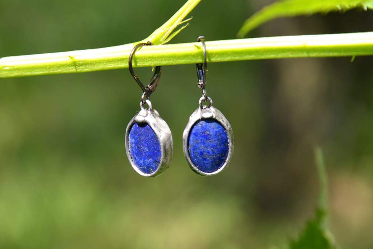 Rustykalne kolczyki z lapis lazuli. Kamienie oprawione w ekologiczną cynę stylizowaną na stare srebro. Długość kolczyka to ok. 3 cm. Biżuteria w 100% wykonana ręcznie, poszczególne sztuki mogą się minimalnie różnić.