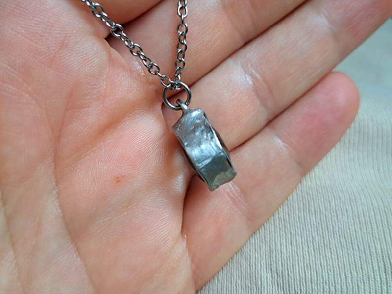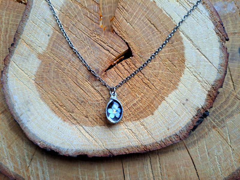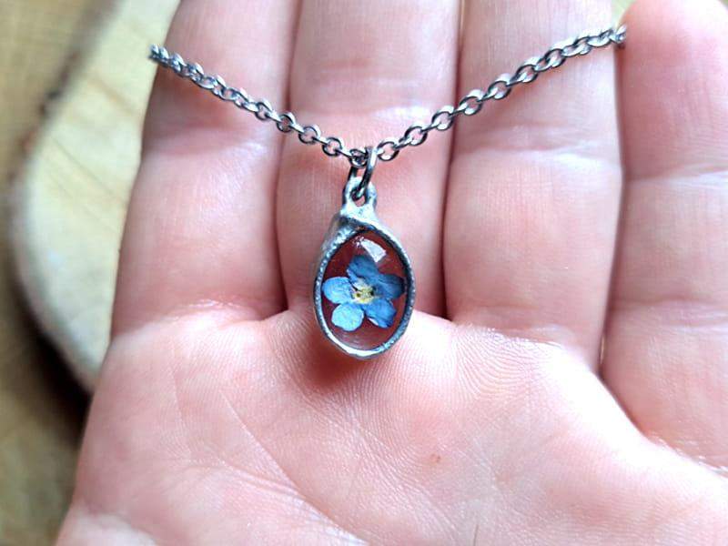 Delikatny, niewielki naszyjnik z zamkniętą w szkle niezapominajką. Wymiary wisiorka to ok. 1,5 x 1 cm. Oprawa w kolorze ciemnego srebra. Łańcuszek ze stali chirurgicznej o długości 45 cm. Biżuteria w 100% wykonana ręcznie, poszczególne sztuki mogą się minimalnie różnić.