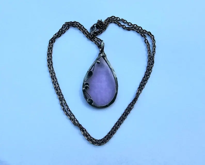 Oryginalny wisior ze szklaną kroplą w pięknym kolorze lila w oprawie z delikatnym ażurowym wzorem