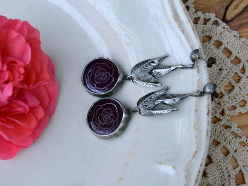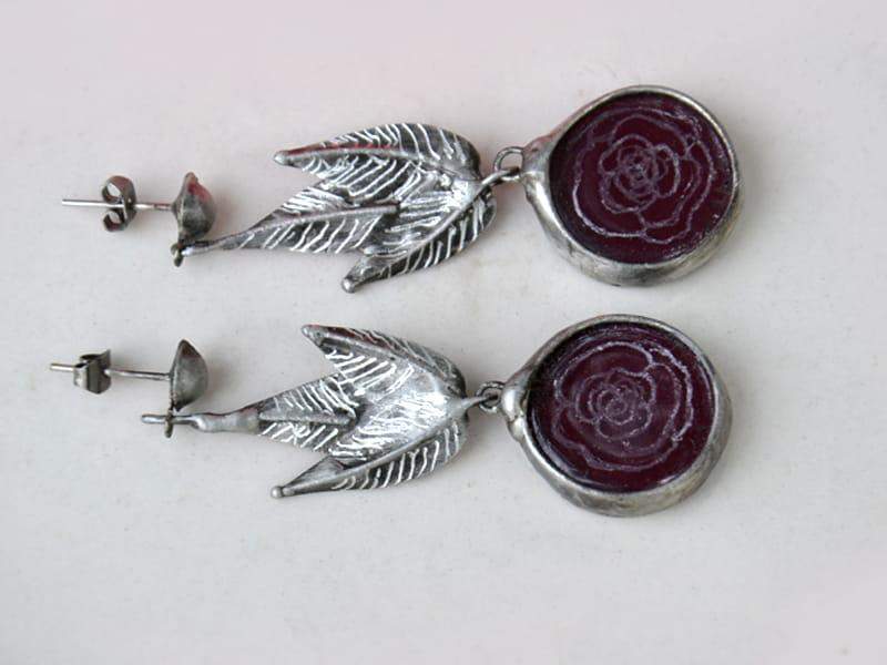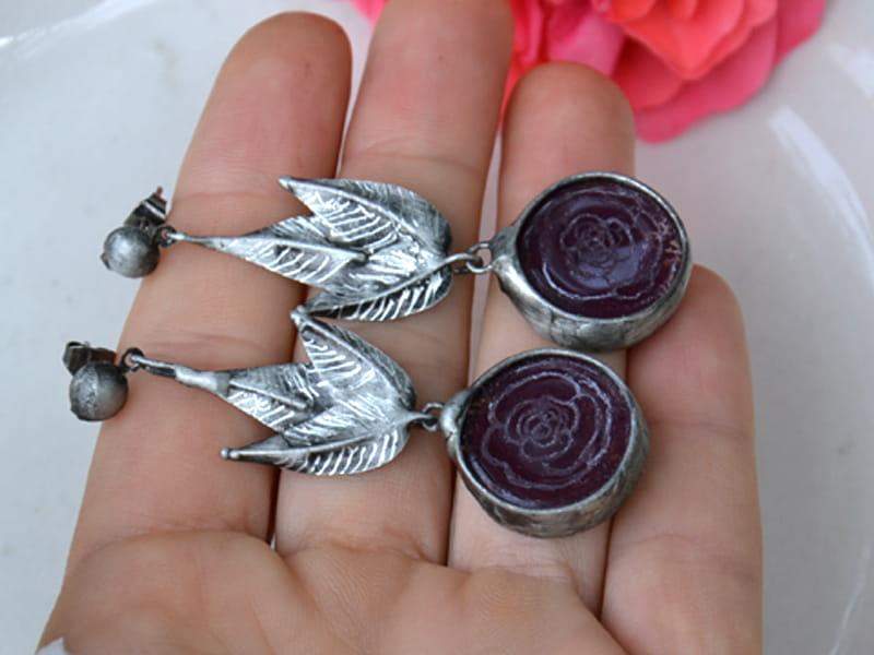 Długie, bardzo efektowne kolczyki z grawerowanym szkłem w kolorze bakłażanowym. Oprawa stylizowana na ciemne srebro. Długość całego kolczyka to ok. 6 cm. Biżuteria w 100% wykonana ręcznie, poszczególne sztuki mogą się minimalnie różnić.