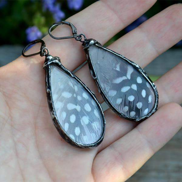 Bardzo efektowne kolczyki z przepiórczymi piórkami zamkniętymi w szkle. Rustykalna oprawa wykonana z miedzi pokrytej ekologiczną cyną w kolorze starego srebra. Długość kolczyka to ok. 6 cm. Biżuteria w 100% wykonana ręcznie, poszczególne sztuki mogą się minimalnie różnić.
