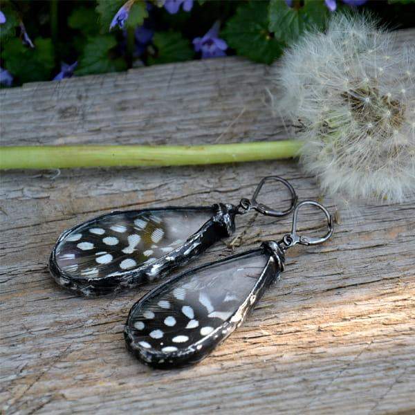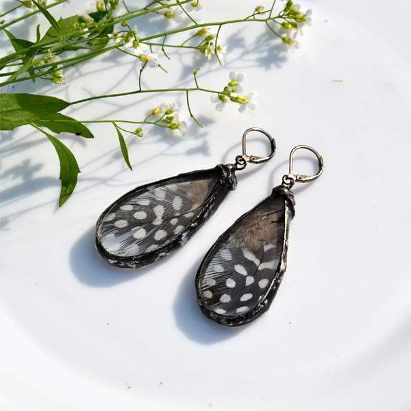 Bardzo efektowne kolczyki z przepiórczymi piórkami zamkniętymi w szkle.