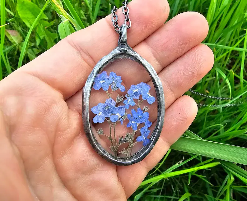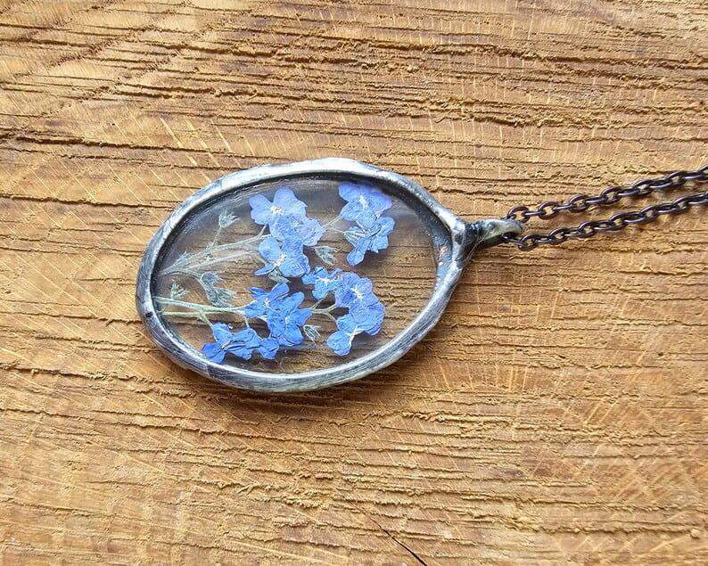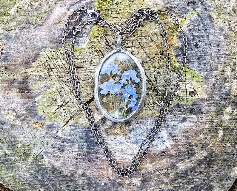 Duży owalny wisior z niezapominajkami zamkniętymi w szkle.