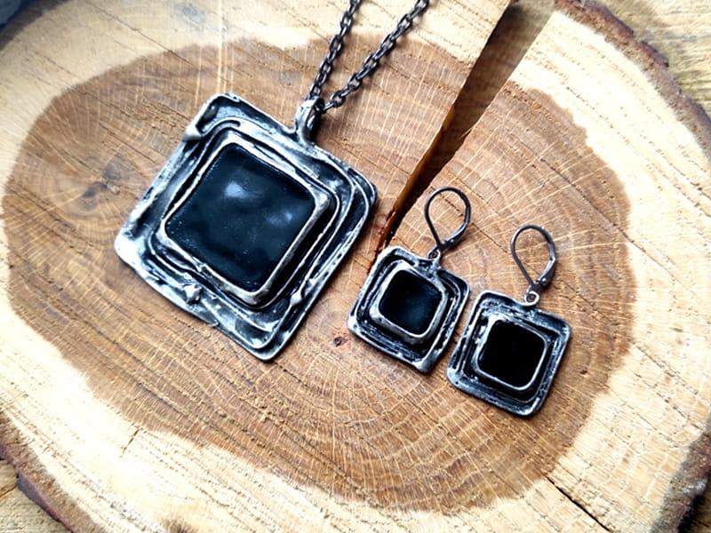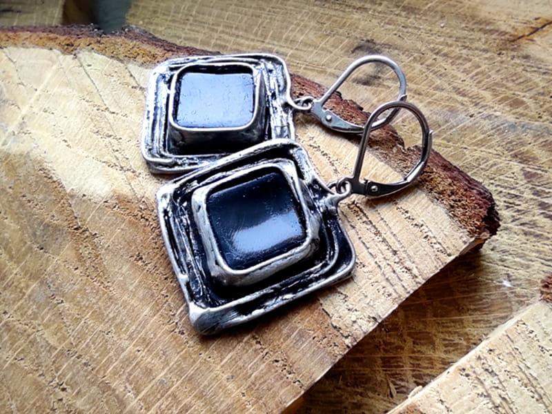 Unikatowe kolczyki ze szkiełkami w czarnym kolorze. Projekt wykorzystuje elementy metaloplastyki połączone z wytopionym przeze mnie szkiełkiem.