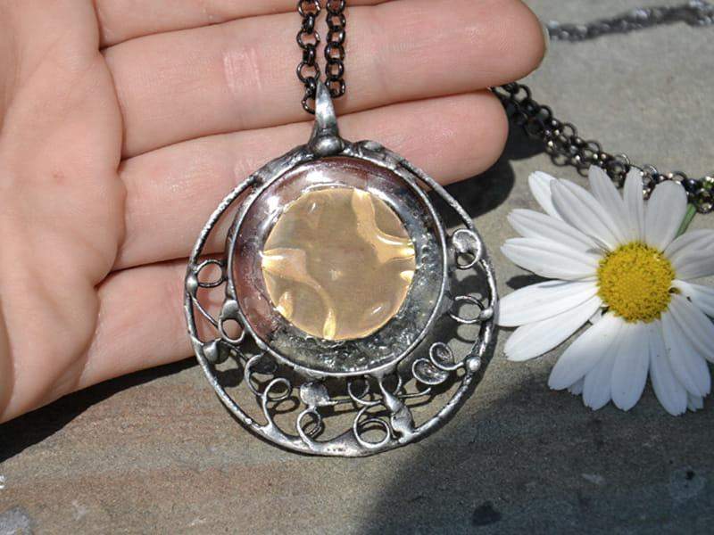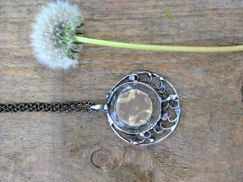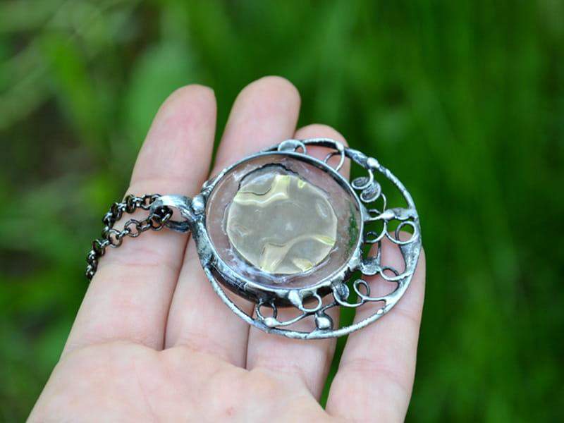 Stylowy, ornamentalny naszyjnik ze szkłem, w które wtopiona jest blaszka w kolorze starego złota. Oprawa i długi łańcuszek w kolorze starego srebra. Średnica wisiora to ok. 5 cm. Biżuteria w 100% wykonana ręcznie