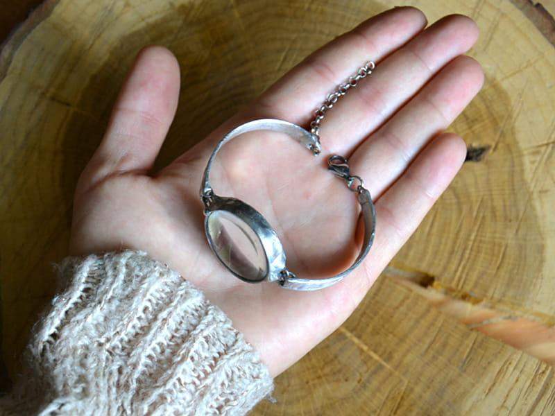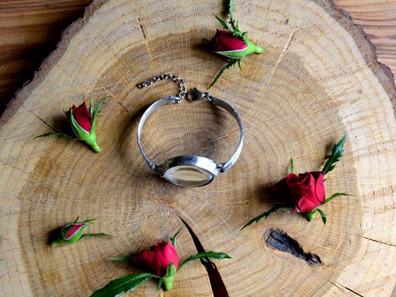 Bransoletka z różą zamkniętą w szkle. Oprawa wykonana z miedzi pokrytej ekologiczną cyną w kolorze srebrnym. Obwód bransoletki to ok. 18 cm + 2 cm regulacji. Bardzo chętnie wykonam bransoletkę w innym rozmiarze! Biżuteria w 100% wykonana ręcznie, poszczególne sztuki mogą się minimalnie różnić.