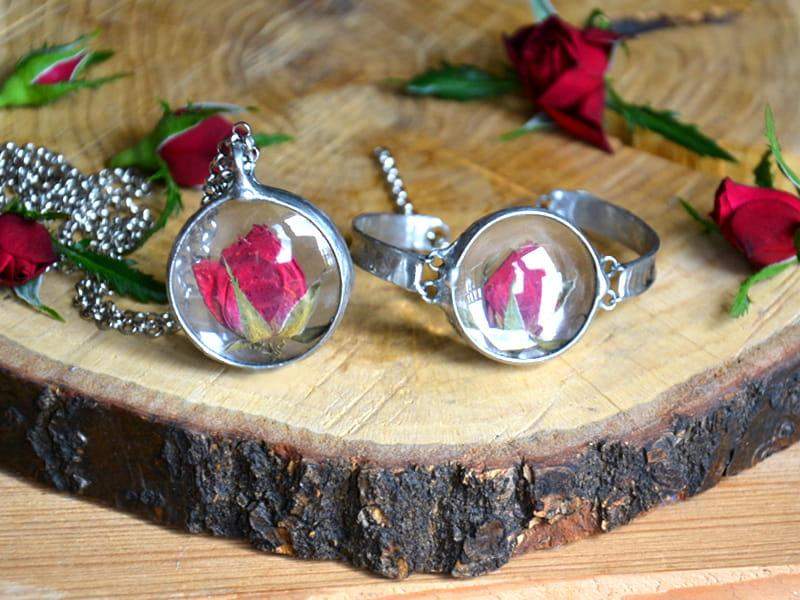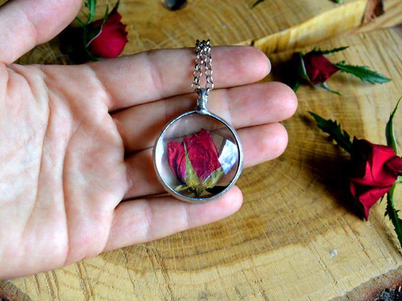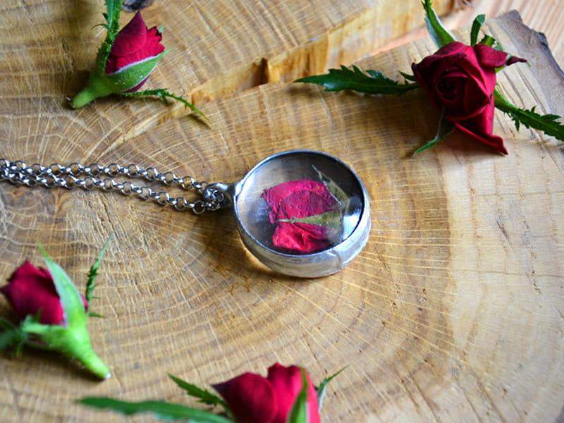 Niepowtarzalny wisior z różą zamkniętą w szkle.