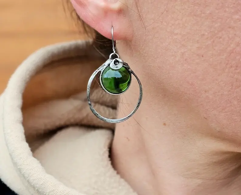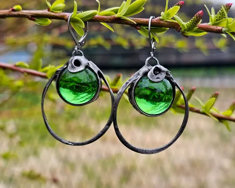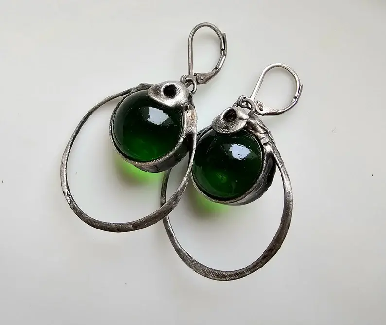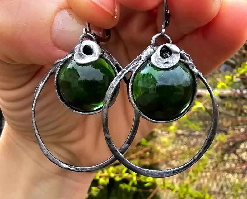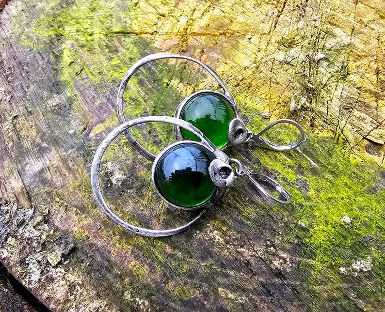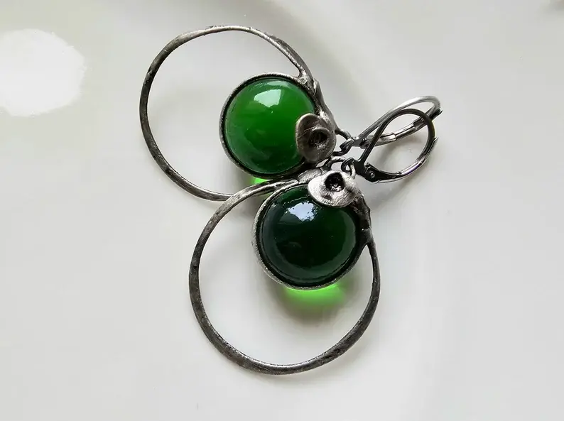 Urokliwe kolczyki ze szklaną kulką w głębokim butelkowym kolorze. Kolczyki wykonane zostały metodą witrażową ze szkła, miedzi i ekologicznej cyny. Oprawa stylizowana jest na kolor ciemnego srebra. Zamykane bigle wykonane są ze stali szlachetnej.