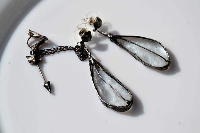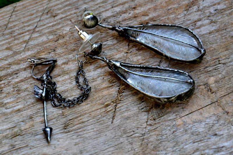 Niezwykle efektowne kolczyki ze szklanymi piórkami. Długość kolczyka to ok. 5,5 cm. Oprawa wykonana z ekologicznej cyny stylizowanej na stare srebro. W prawym kolczyku łańcuszki o długości ok. 4 i 5 cm z klipsem. Biżuteria w 100% wykonana ręcznie, poszczególne sztuki mogą się minimalnie różnić.