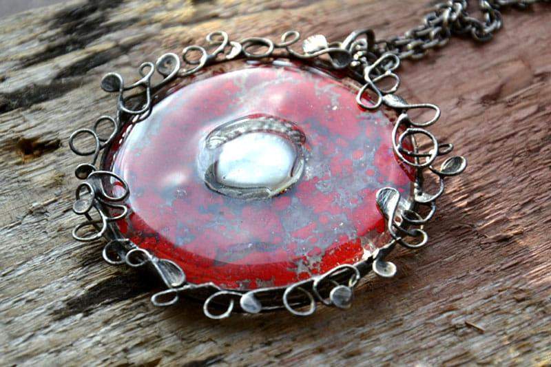 Unikatowy naszyjnik w stylu retro w intrygującym kolorze. Wytopione przeze mnie szkło o średnicy ok. 5 cm misternie oprawione w cynę stylizowaną na stare srebro. W komplecie długi łańcuszek. Biżuteria w 100% wykonana ręcznie, poszczególne sztuki mogą się minimalnie różnić