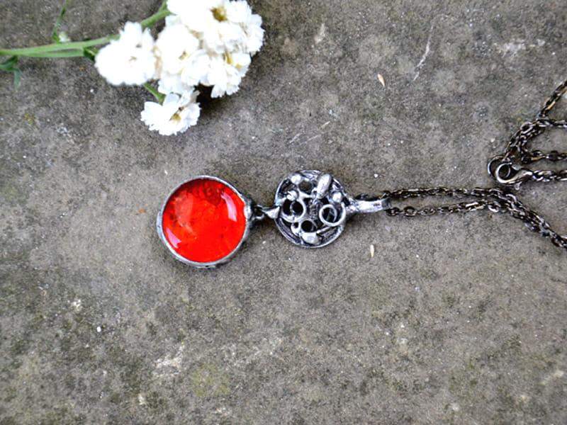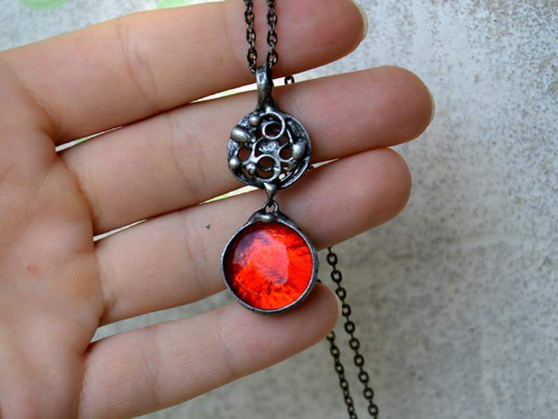 Efektowny naszyjnik ze stapianym szkłem w pięknym kolorze. Oprawa wykonana z miedzi pokrytej ekologiczną cyną, stylizowana jest na stare srebro. Do wisiora dołączony jest łańcuszek o długości 50 cm. Długość zawieszki to ok. 4,5 cm. Biżuteria w 100% wykonana ręcznie, poszczególne sztuki mogą się minimalnie różnić.